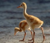 Sandhill cranes chicks are precocial, meaning they are born in an advanced state compared to other birds such as songbirds. Within 2-3 hours after hatching, their yellow-brown down feathers are dry and their eyes are open. Young chicks can leave the nest by walking or swimming within 8 hours after hatching, but more often leave the nest within 24 hours after hatching. Sandhill crane chicks weigh on average 0.25 lbs (114 grams), a little lighter than an apple. When sandhill crane chicks are born, they are only partially able to regulate their body temperature, and usually wriggle under the adults’ wings and other body feathers for warmth and protection. Chicks begin feeding within 24 hours after hatching. Young chicks will follow their parents and be fed by them, pecking food from their parent’s beaks. Once the chicks are older, they can feed themselves, but the parents may still present new food items to their chicks. If there are two chicks, often they will separate with each going with one adult. This helps reduce competition for food.